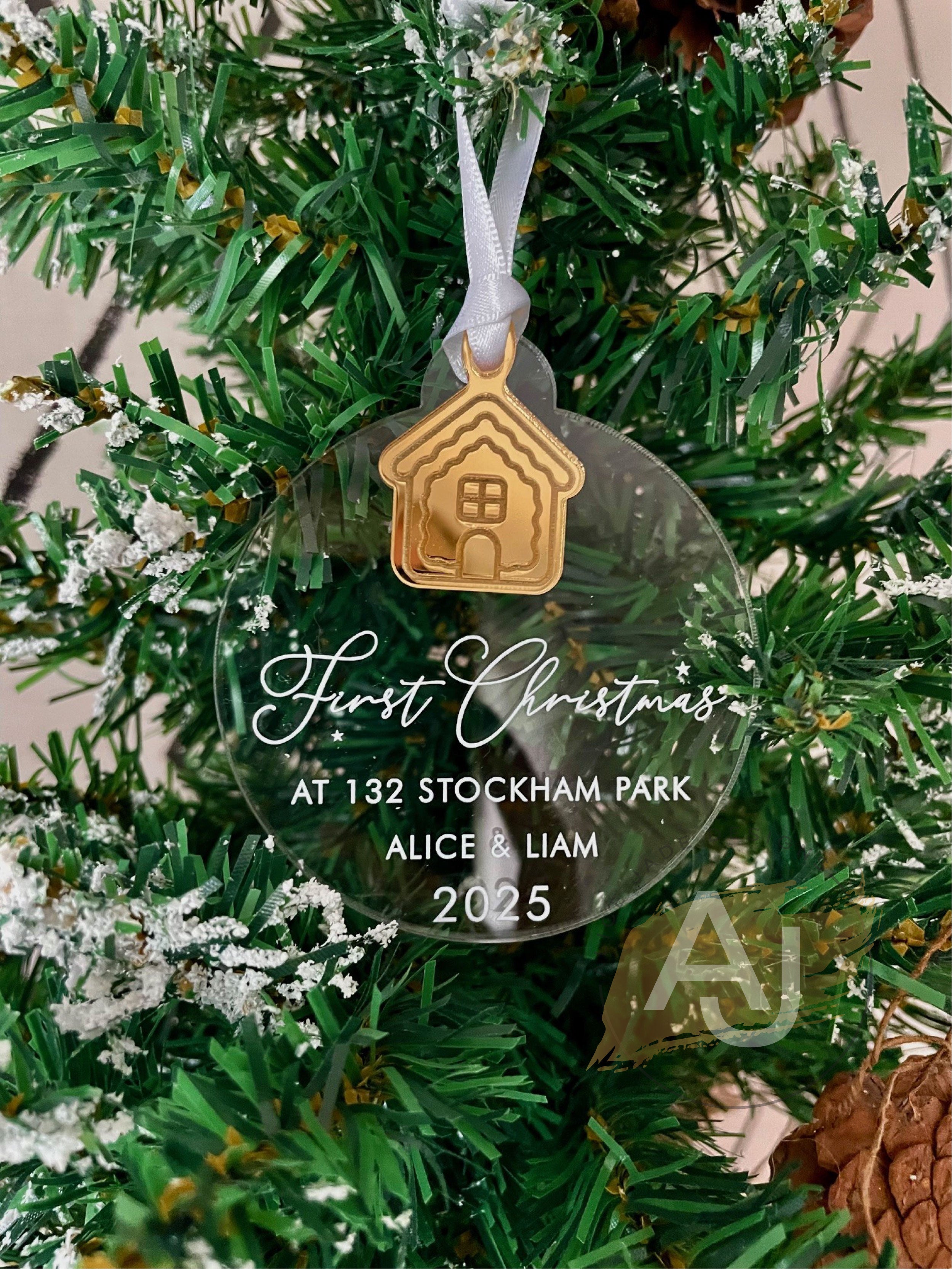 A stunning two-layered hanging Christmas decoration, perfect for celebrating a first Christmas in a new home! The charm is made from mirror acrylic that overlays the top of a personalised acrylic bauble with an area of customised text such as the year.